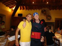 Metti una sera a cena. Metti anche un compleanno, che significa un paio di bicchieri in più per tutti. Metti anche il posto che si presta particolarmente. Il contesto agreste, la pace della sera, due o tre milioni di zanzare tigre, una ventina di maiali, una decina di mucche, oche e galline, e tanta pace. Menù prossimo alla perfezione, con tanto di torta suprema. E gli Agriterroristi dietro l’angolo. Grande responsabile è Lo Ignorante, che per tutta la sera sforna le armi del delitto. Suo il tempismo di far comparire un pallone nell’aia della candida cascina. Due porte improvvisate, squadre fatte in velocità e senza criterio, torso nudo d’ordinanza, e gli Agriterroristi si lanciano in una sfida con tanto di erba bagnata. Salvo, detto anche la Primula del Giambellino, gioca come se fosse la finale dei mondiali. Ha la stessa classe di Gattuso e gli stessi riflessi di Totti. L’Ispettore Monazzo gioca come ragiona, tanto da far supporre origini brasiliane. La partita viene purtroppo interrotta da una maleducatissima cameriera che ci ammonisce. Ma il primo cartellino giallo non spaventa la squadra, che abbandona l’aiuola di piante rare e ripara dentro il ristorante. E qui entra di nuovo in gioco Lo Ignorante, ancora responsabile del misfatto. Suo il regalo per l’Elegante: un set da 25 pezzi per percussionisti. In pochi secondi il tavolo si trasforma, e la Banda del Palo inizia a suonare i suoi successi, regalando emozioni uniche ai tavoli vicini. Veniamo ammoniti nuovamente, secondo cartellino uguale espulsione, non prima di aver pagato ovviamente.